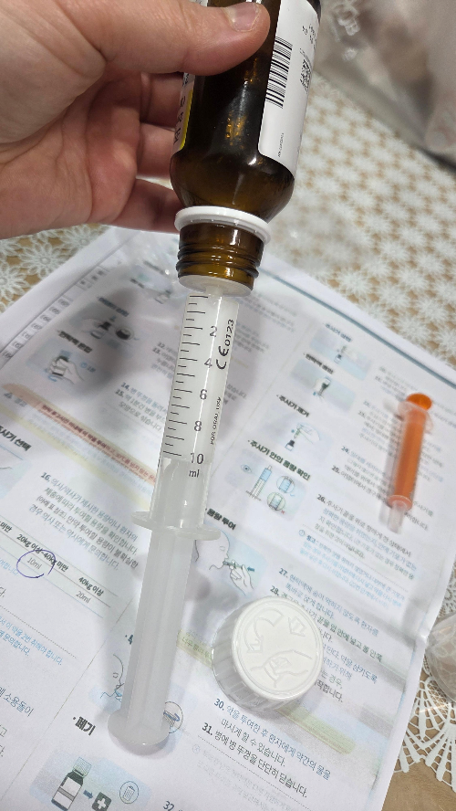 • 주사기로 뽑기: 병을 거꾸로 든 상태에서 밀대를 천천히 당겨 공기 방울 없이 맞춥니다.